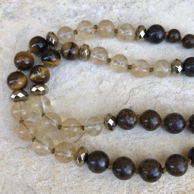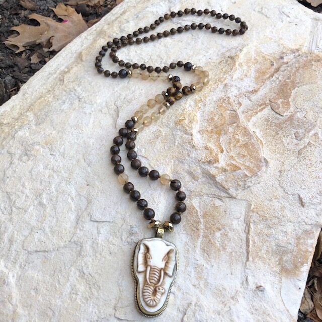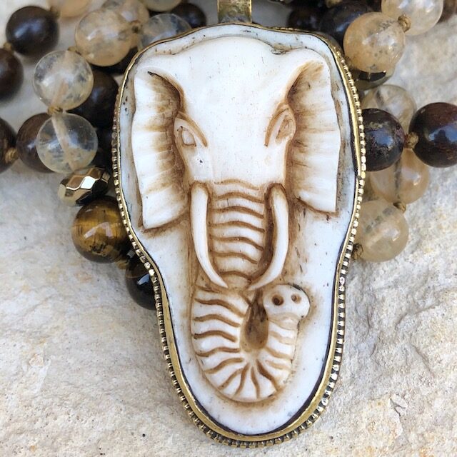 Tibetan Elephant pendant, hand carved bone and inset in brass; hand knotted with 108 8mm and 6mm Bronzite, 8mm Golden Tiger Eye, 8mm Golden Rutilated Quartz plus Pyrite spacer beads. This mala measures approximately 21 inches in length, including pendant. Only one available.
