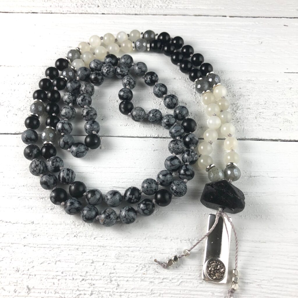 The New Moon Mala is composed of Moonstone, Onyx, Snowflake Obsidian and Mystic Labradorite 8mm beads with a raw Tourmaline guru, a silver-plated Druzy crystal pendant and silver spacer beads. It is hand knotted with 108 beads and measures approximately 22 inches in length.