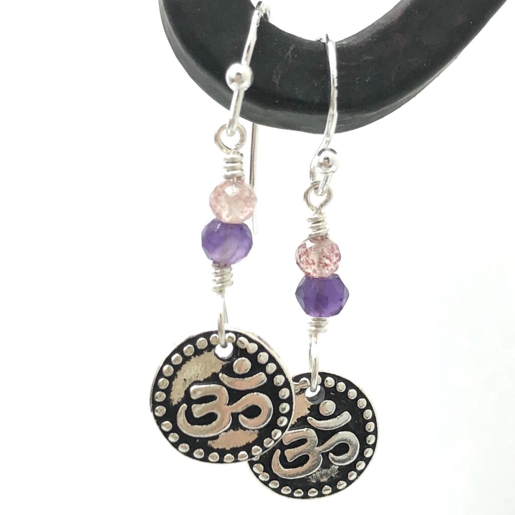 Antique Silver Plate TierraCast Ohm charms, wire wrapped with micro faceted Amethyst and Pink Tourmaline stones, finished with Sterling Silver ear wires.