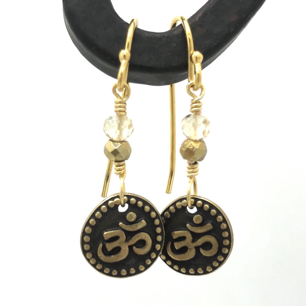 Oxidized Brass Plate TierraCast Om charms, wire wrapped with micro faceted Citrine and Pyrite stones, finished with Gold Vermeil ear wires (14k gold electroplated over Sterling Silver).