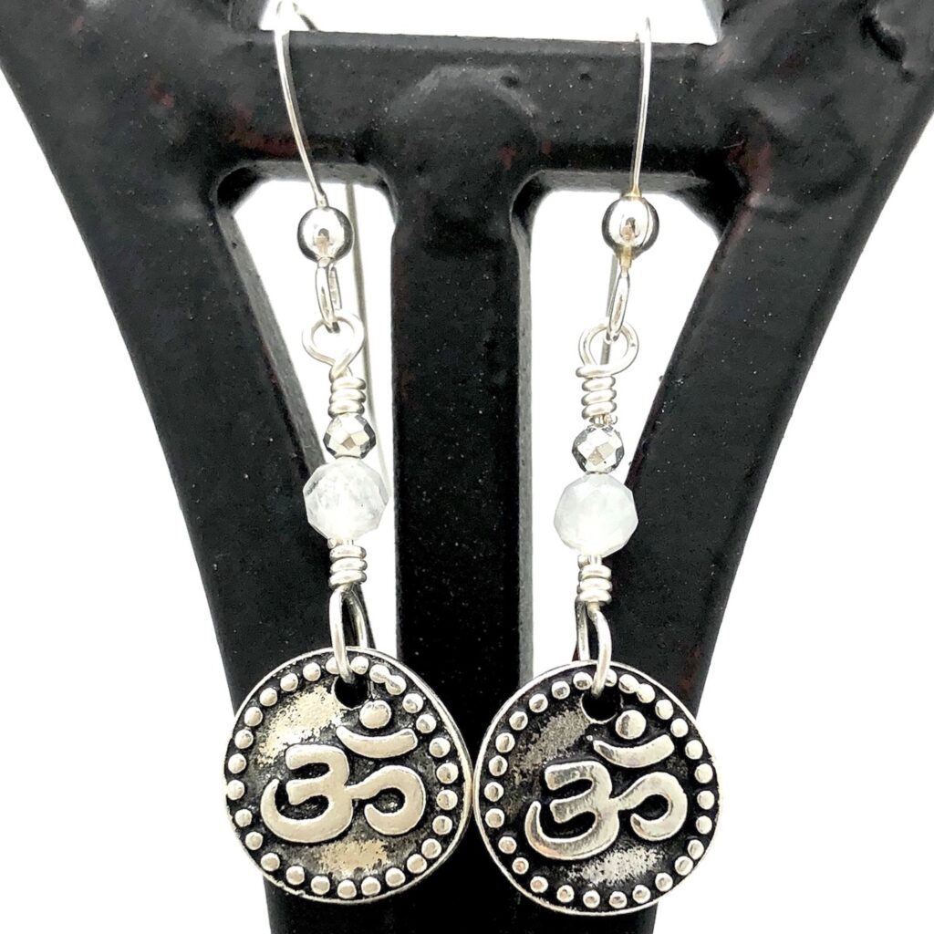 Antique Silver Plate TierraCast Ohm charms, wire wrapped with micro faceted Moonstone and Pyrite stones, finished with Sterling Silver ear wires.