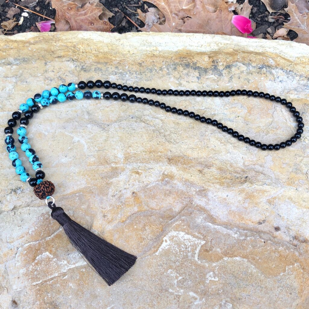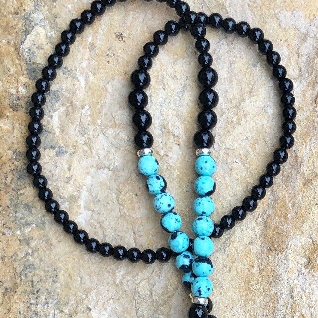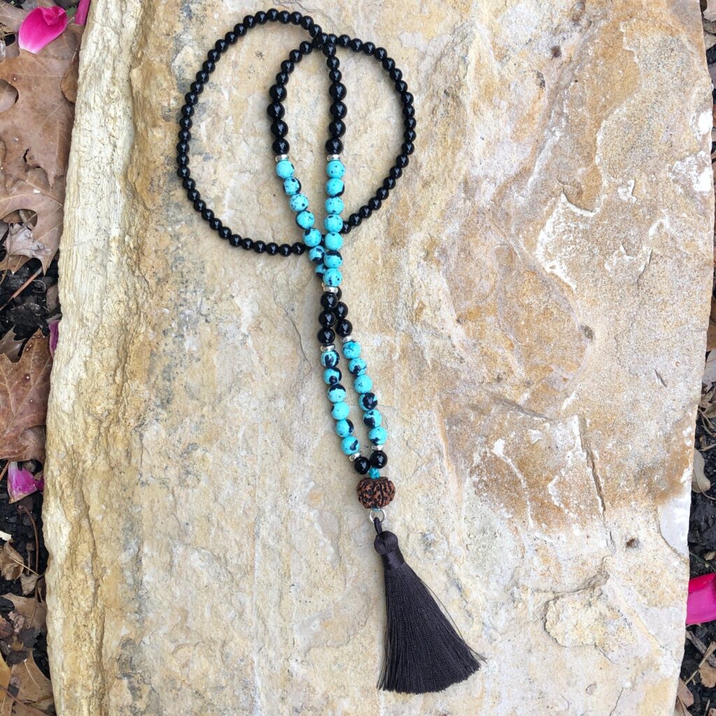108-bead mala; 6mm & 8mm Robin Egg Dolomite (made from a high-grade dolomite marble often noted for its resemblance to jade, permanently dyed and glazed to seal the color in) and Onyx beads with silver coated spacers, Rudraksha seed and cotton silk tassel. This mala is strung on a strong nylon cord and measures approximately 19 inches in length. Although I rarely incorporate dyed stones into my designs, I thought the Robin Egg color combination was too beautiful and striking to pass on.