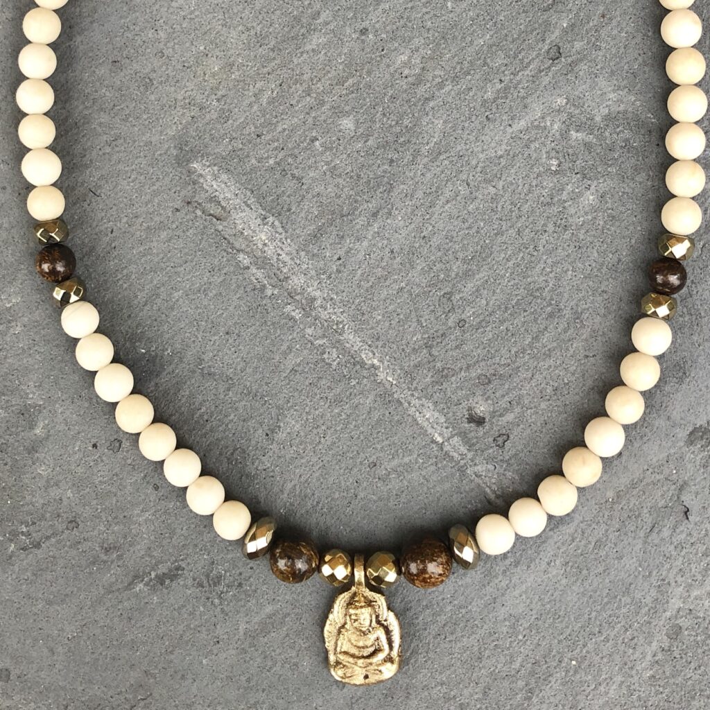 Brass Buddha pendant from Nepal, 6mm & 8mm Natural Riverstone Jasper, Bronzite and Pyrite beads with gold plated toggle clasp, 16in (can extend to 17in).