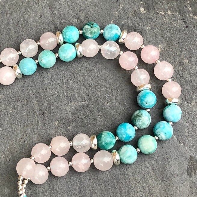 Silver plated Bronze Lotus with Ohm Center pendant on a 108-bead mala; 6mm & 8mm Hemimorphite and Rose Quartz beads with silver seed beads, silver plated brass spacers and Rudraksha guru bead. This mala is made with strong nylon cord and hangs approximately 19 1/2 inches in length.